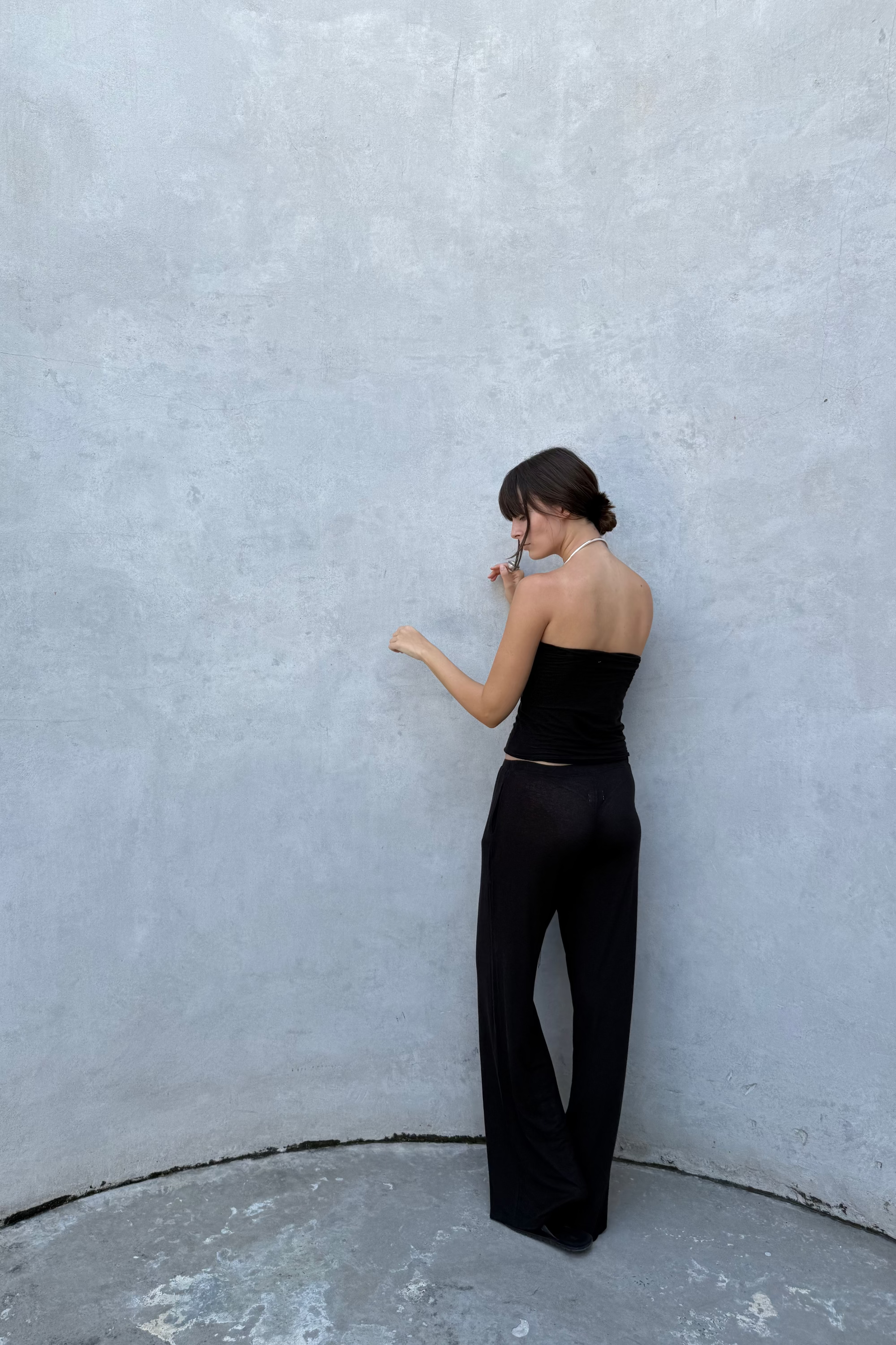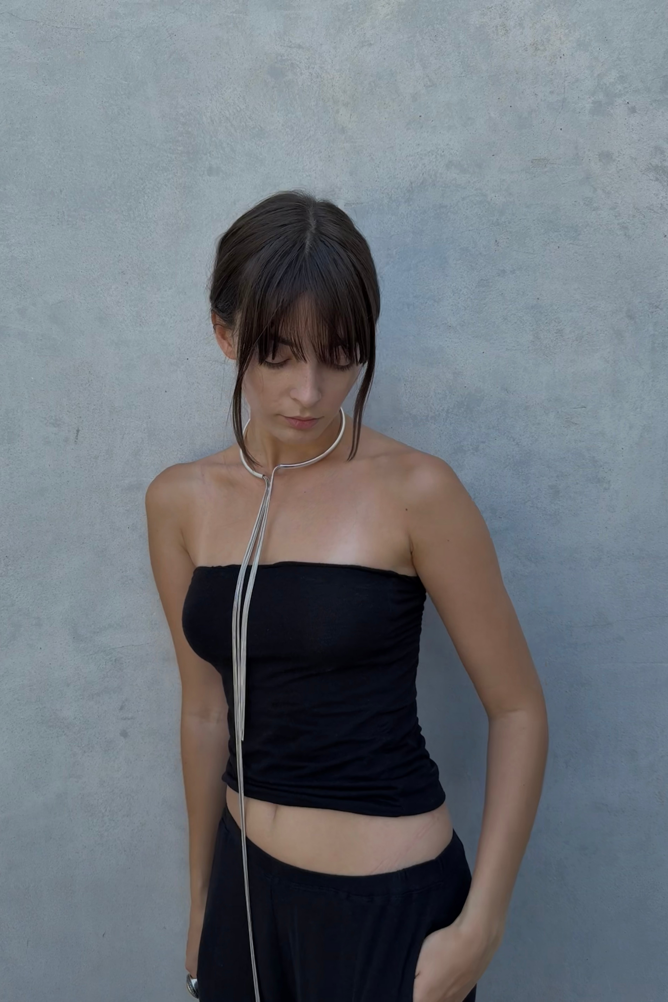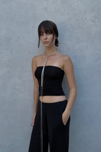 Soft knit bandeau top. The double-layered design offers a comfortable fit and light support. Its clean, minimal shape makes it the perfect base layer — gently hugging the body and staying invisible under semi-sheer long sleeves or tank tops. Minimal details, maximum freedom and natural ease.