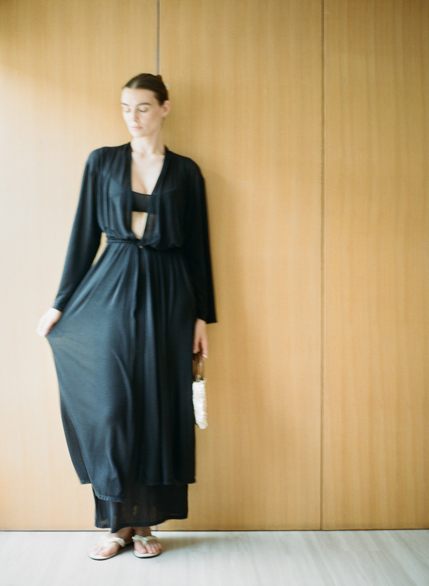 Lightweight and airy maxi-length knit kimono, designed for unhurried days and special moments. Straight sleeves and a softly cascading silhouette emphasize sophistication, while the inner belt allows you to adjust the fit and tie it in multiple ways — from a relaxed draped style to a defined waistline. The semi-sheer texture of the fabric creates a gentle play of light and shadow in motion, adding a sense of weightlessness.