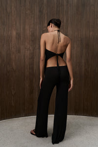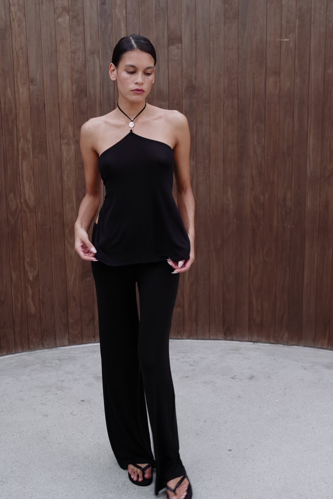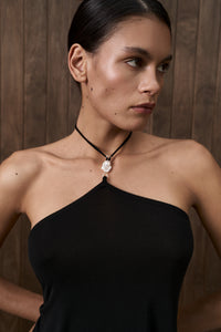 Minimalist halter top crafted from a soft, breathable knit that gently follows the body. The open-back silhouette is balanced by a signature natural baroque pearl at the neckline — a subtle yet expressive accent.