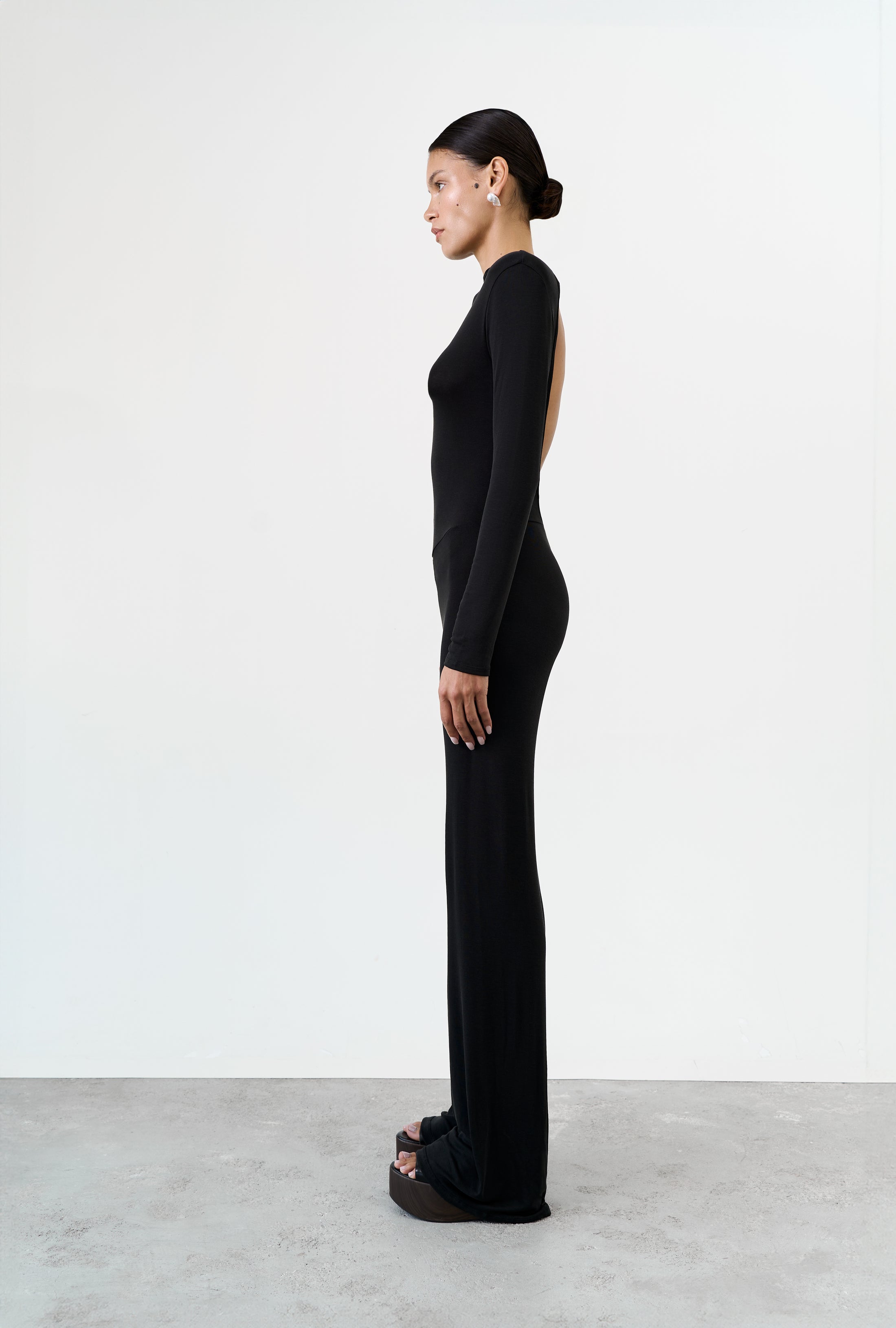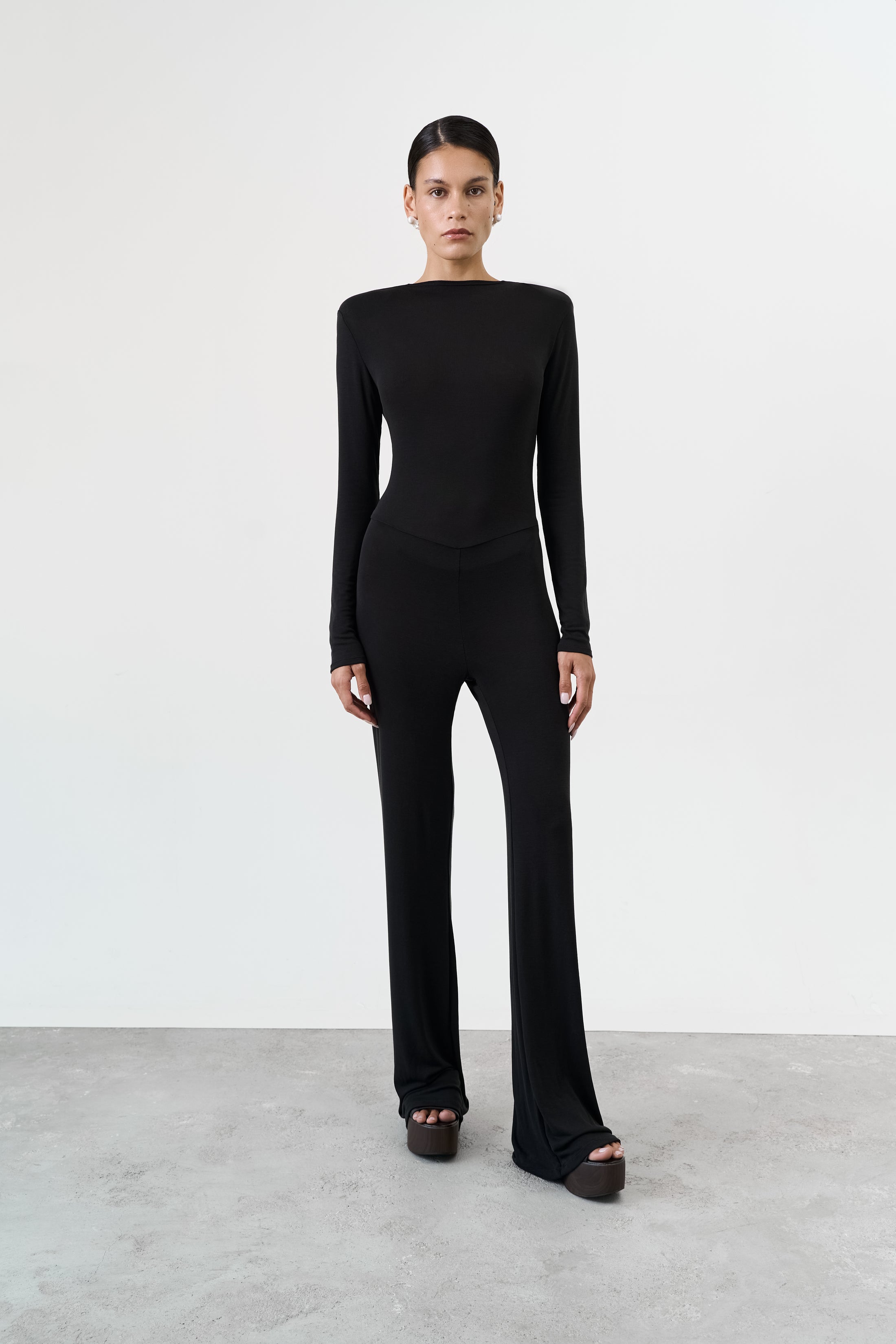 Sleeveless jumpsuit in a smooth lyocell-viscose knit with soft stretch and fluid drape. Low-rise flared trousers create an elongated silhouette. Open back finished with a natural baroque pearl accent — the signature UMI detail. Breathable and gentle on the skin, ideal for warm climates.