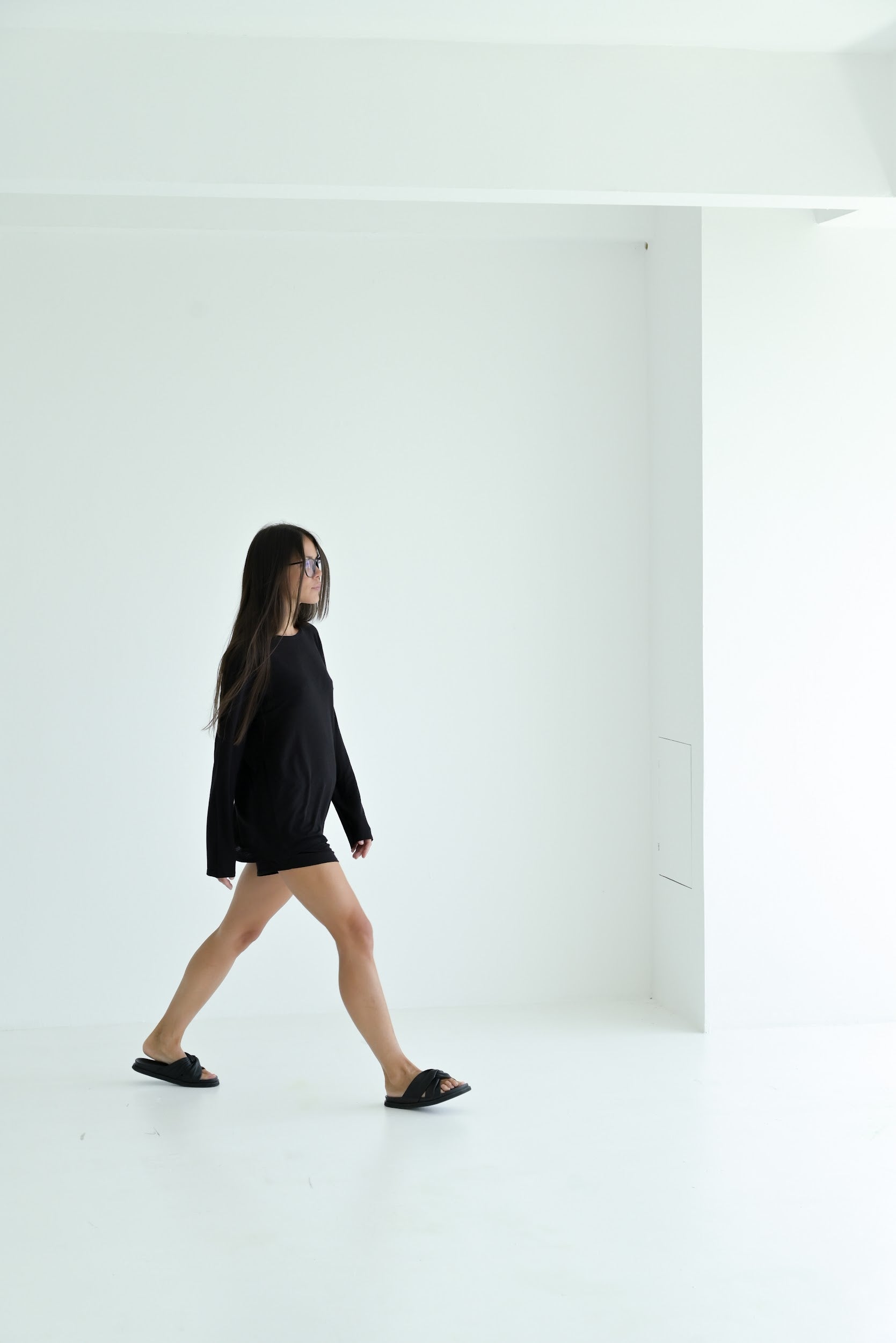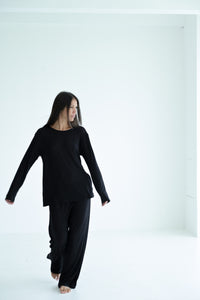 Long-sleeve top made from lightweight linen knit with Tencel. The semi-sheer fabric gently drapes over the body, highlighting natural lines and form. With its relaxed silhouette and fluid sleeves, it feels effortlessly airy and soft — perfect as a base layer or a subtle statement on its own.