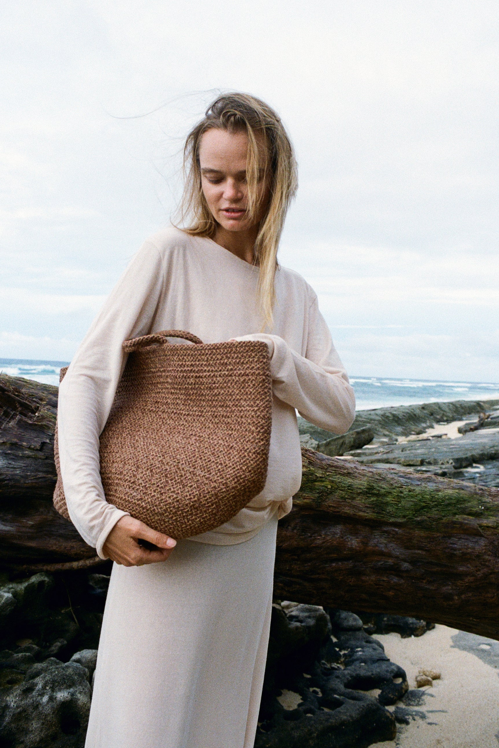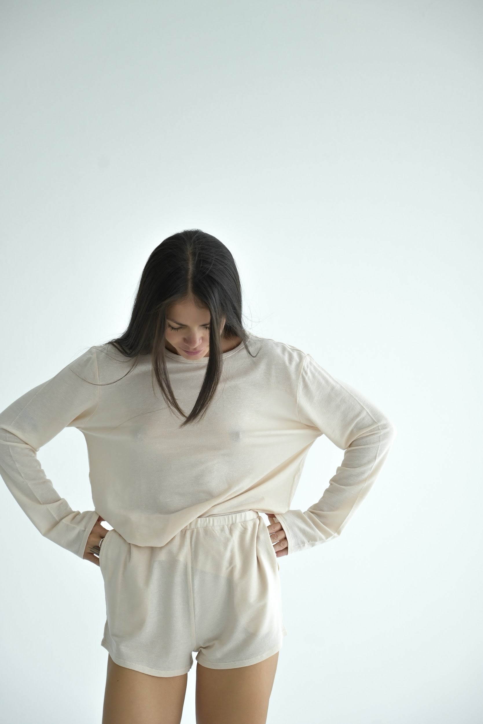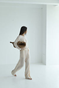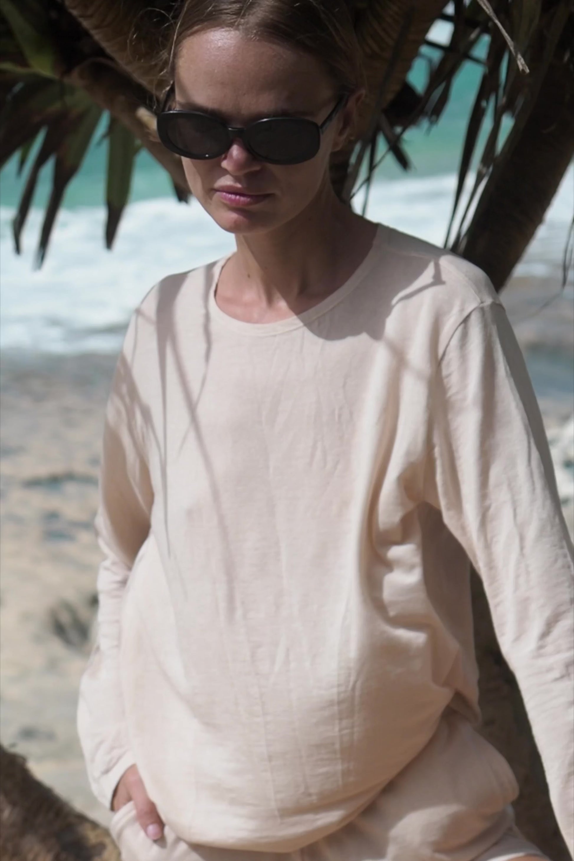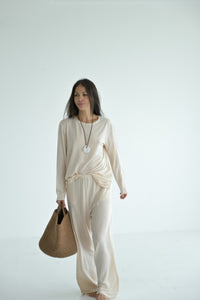 Long-sleeve top made from lightweight linen knit with Tencel. The semi-sheer fabric gently drapes over the body, highlighting natural lines and form. With its relaxed silhouette and fluid sleeves, it feels effortlessly airy and soft — perfect as a base layer or a subtle statement on its own.