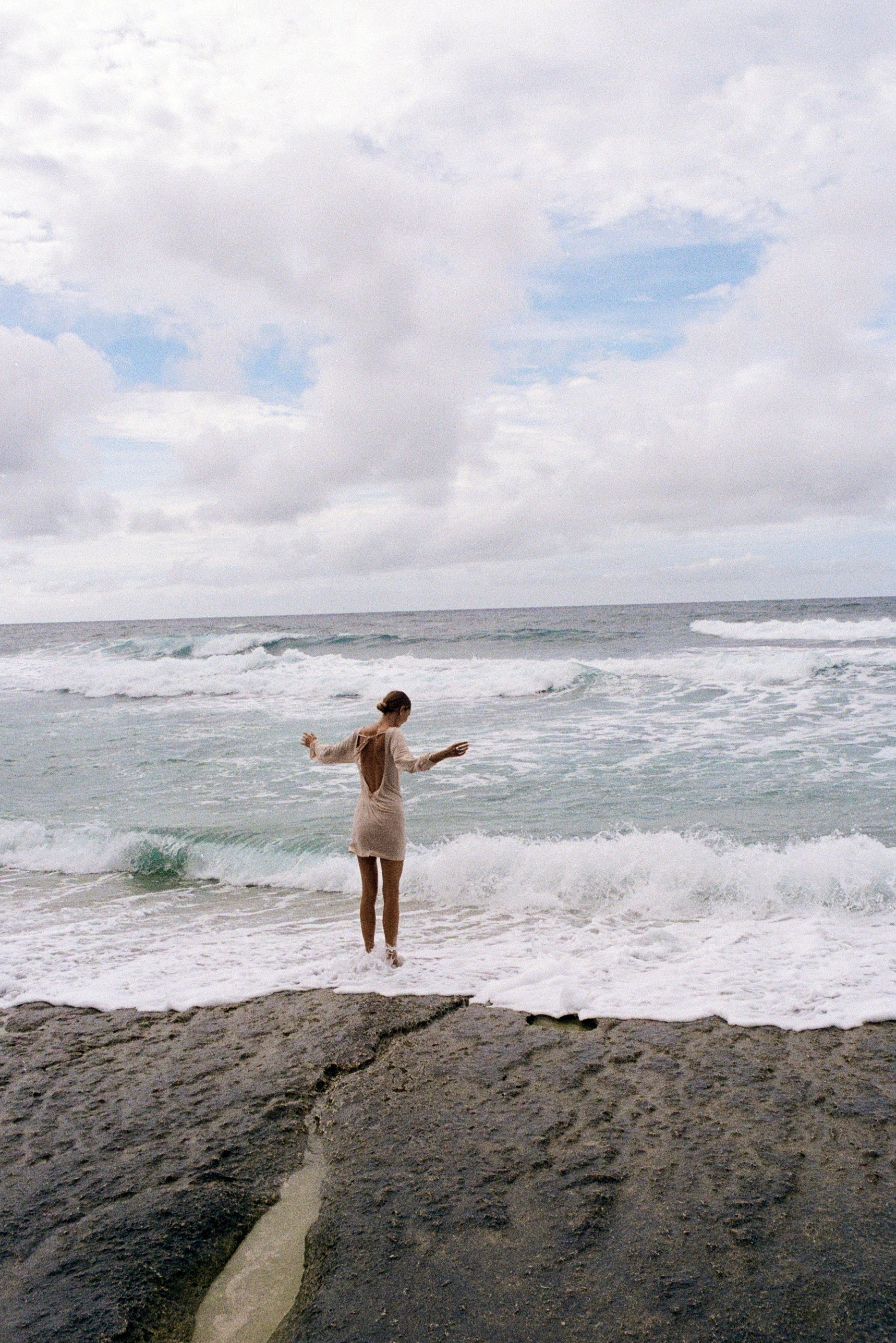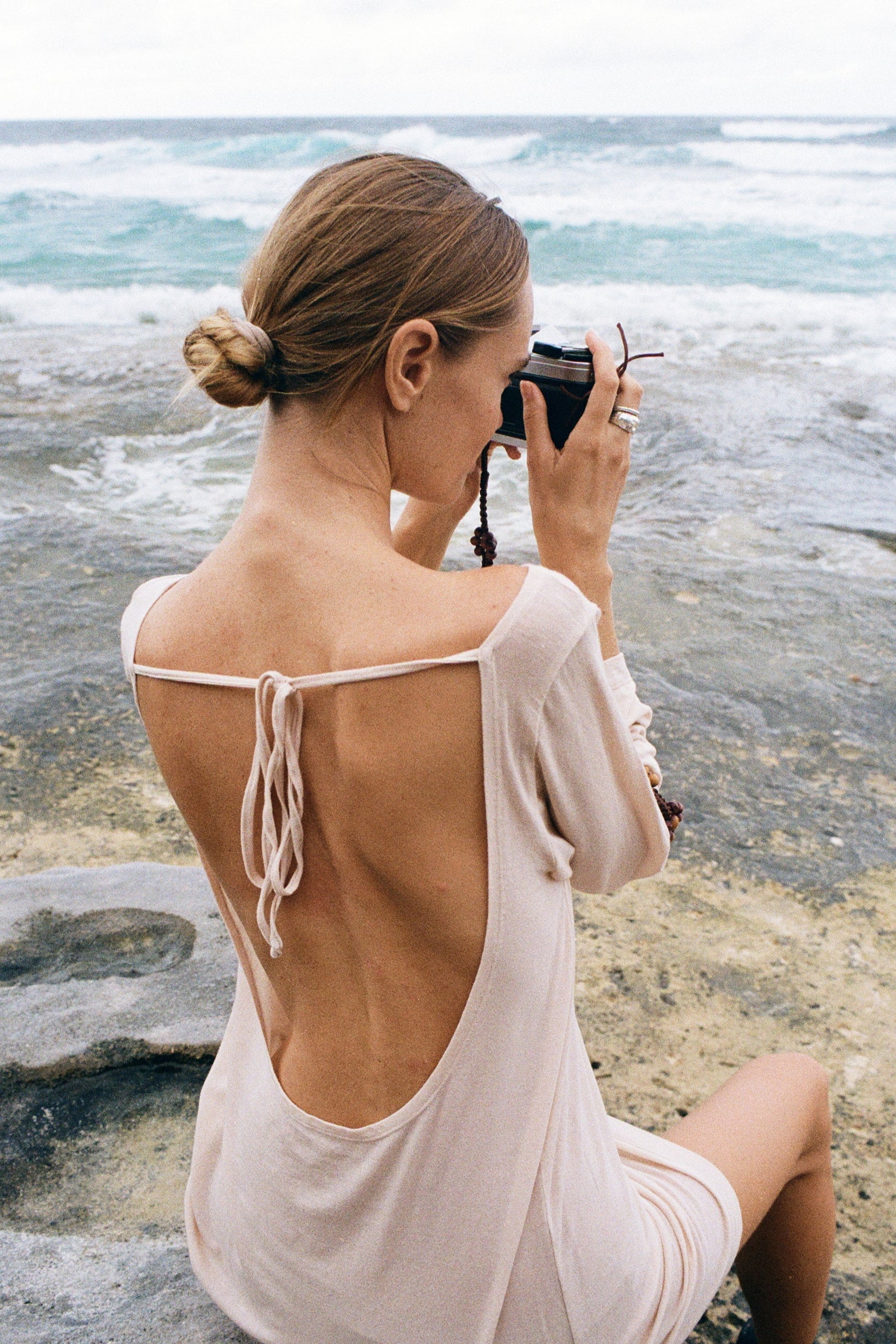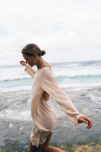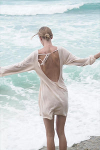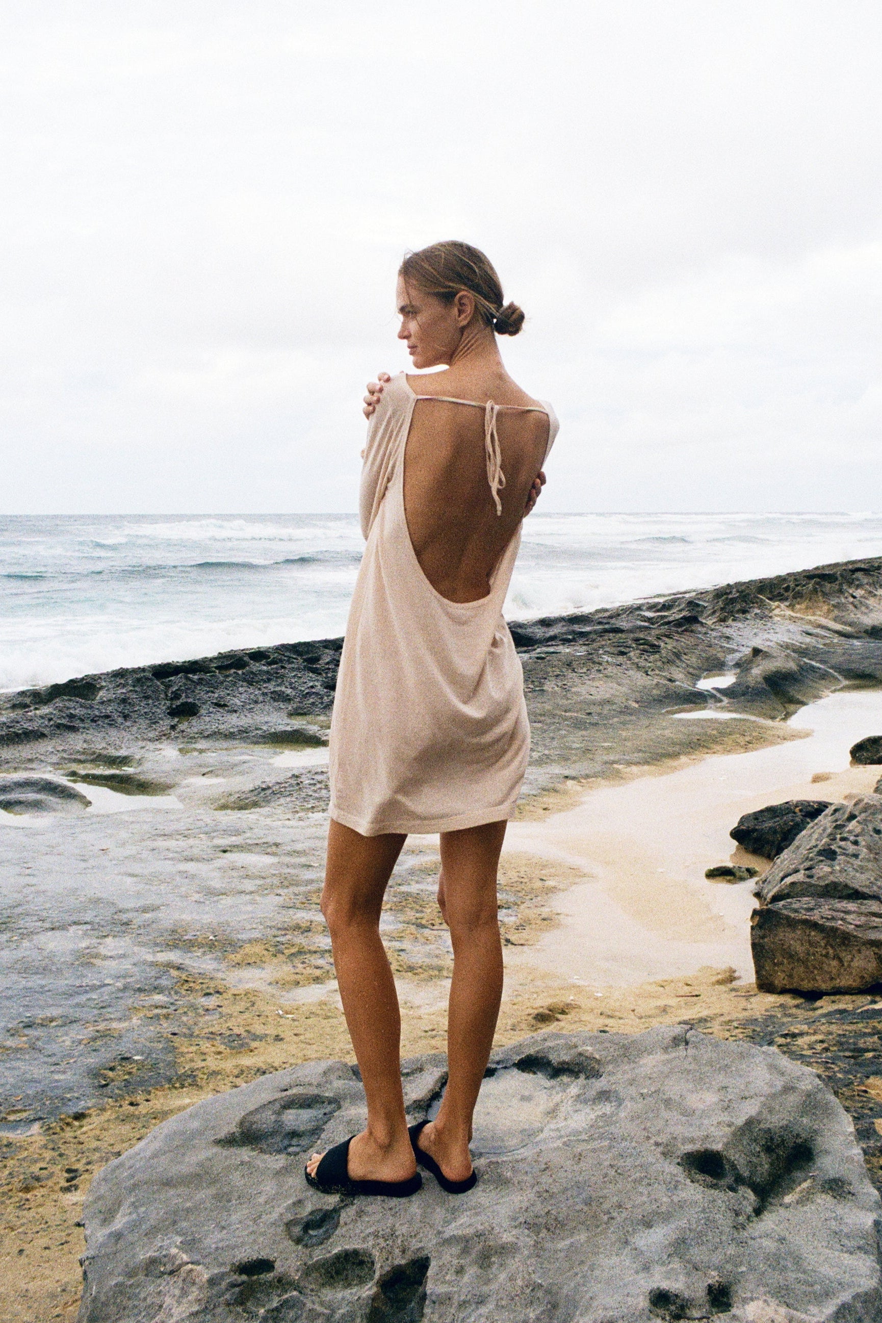Mini long-sleeve dress made from lightweight linen knit with Tencel. The semi-sheer fabric feels soft on the skin and moves easily with the body. An open back with a tie detail adds a relaxed, effortless feel. Easy to wear on warm days — light, simple, and comfortable.