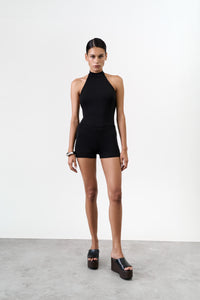 Short double-layer halter jumpsuit in a smooth lyocell-viscose blend with a soft stretch feel. Halter neckline with long ties and an open back. Clean, minimal front and a fitted silhouette that contours the body. Lightweight and breathable — ideal for warm climates and resort styling.