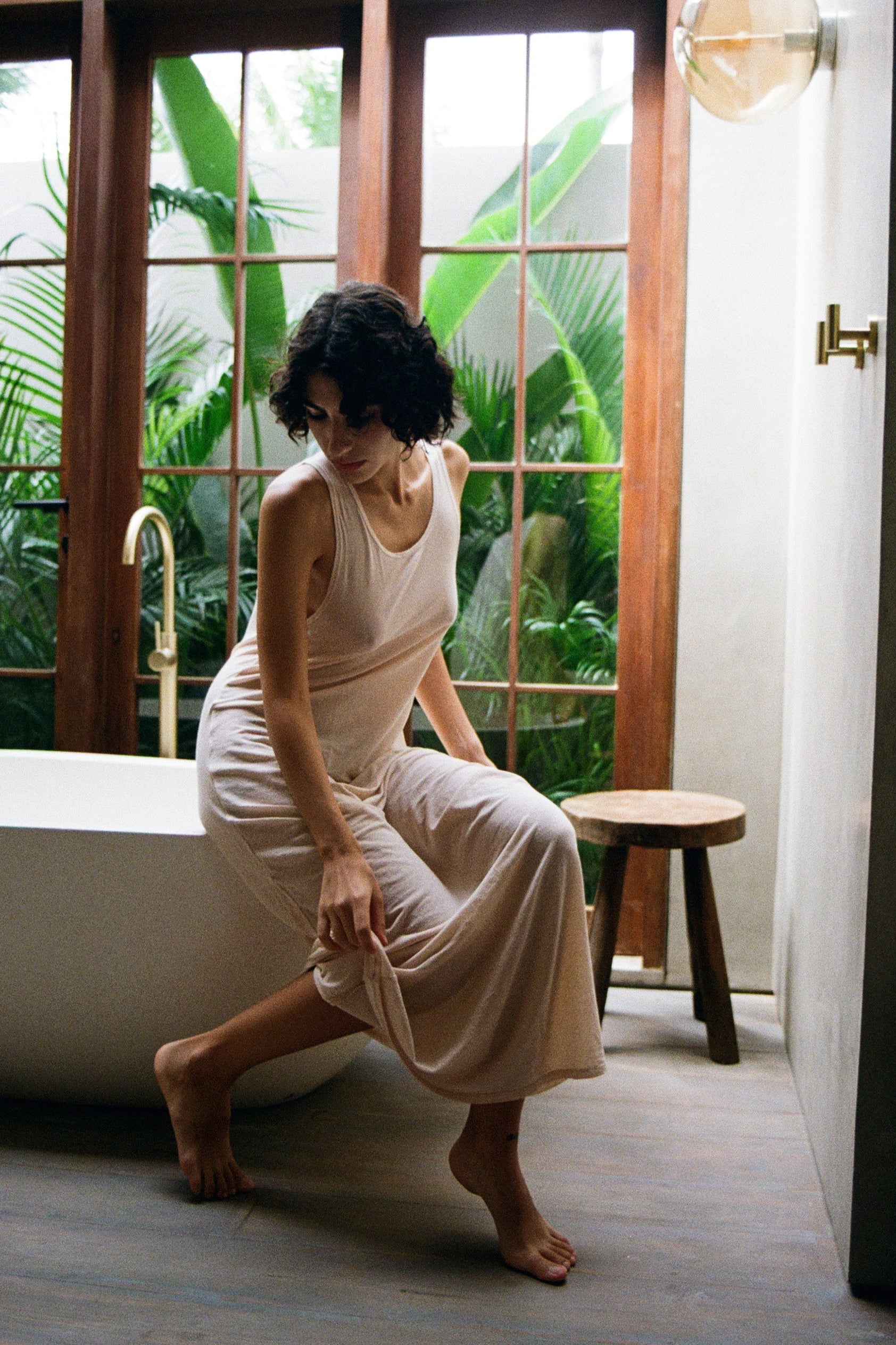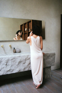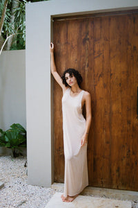 Maxi dress made from lightweight knit. The semi-sheer fabric flows softly over the body, letting the silhouette show through. A deep scoop back and open sides highlight the shape, while gently covering the chest. Comfortable, easy, and made to move with you.