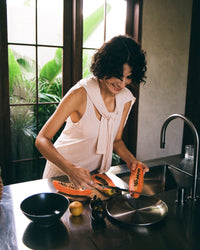Tank top made from lightweight linen knit with Tencel. The semi-sheer fabric feels soft and light on the skin. Its relaxed fit follows the body’s shape, while the deep scoop back adds a feminine and striking touch. Perfect for warm days and easy layering.
